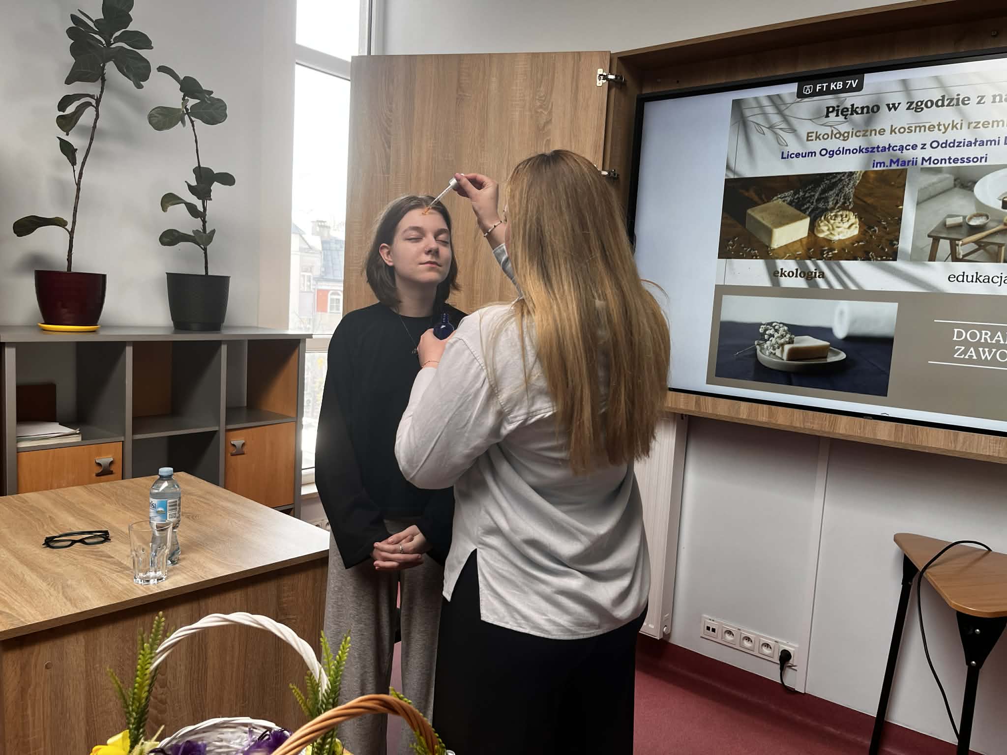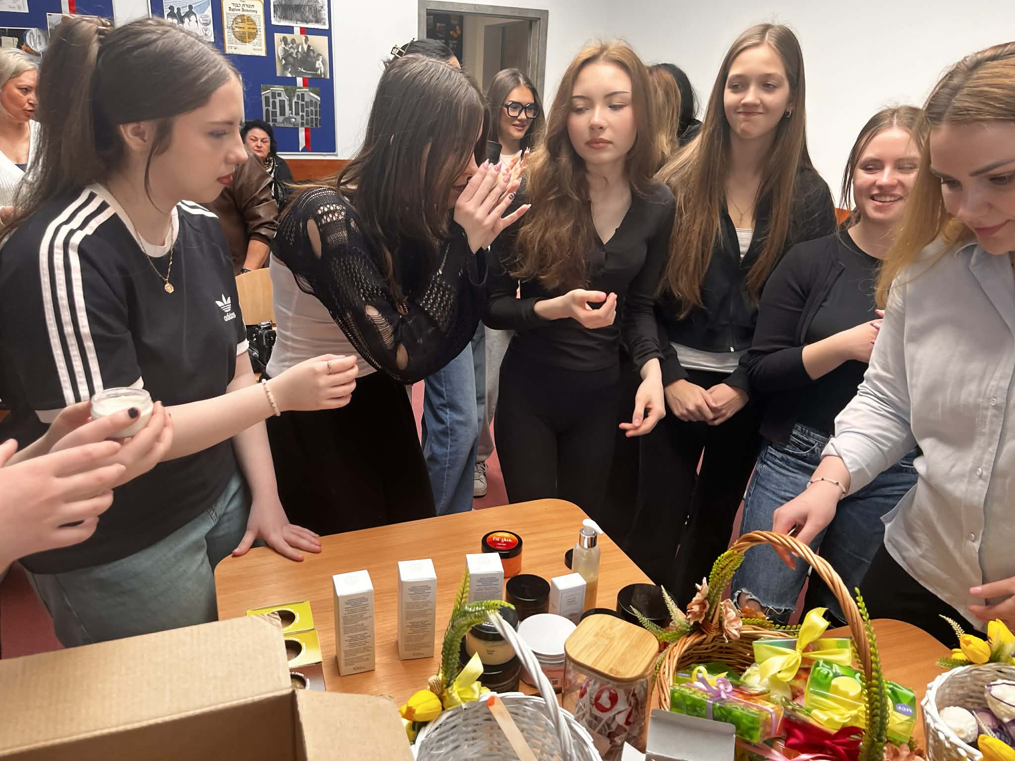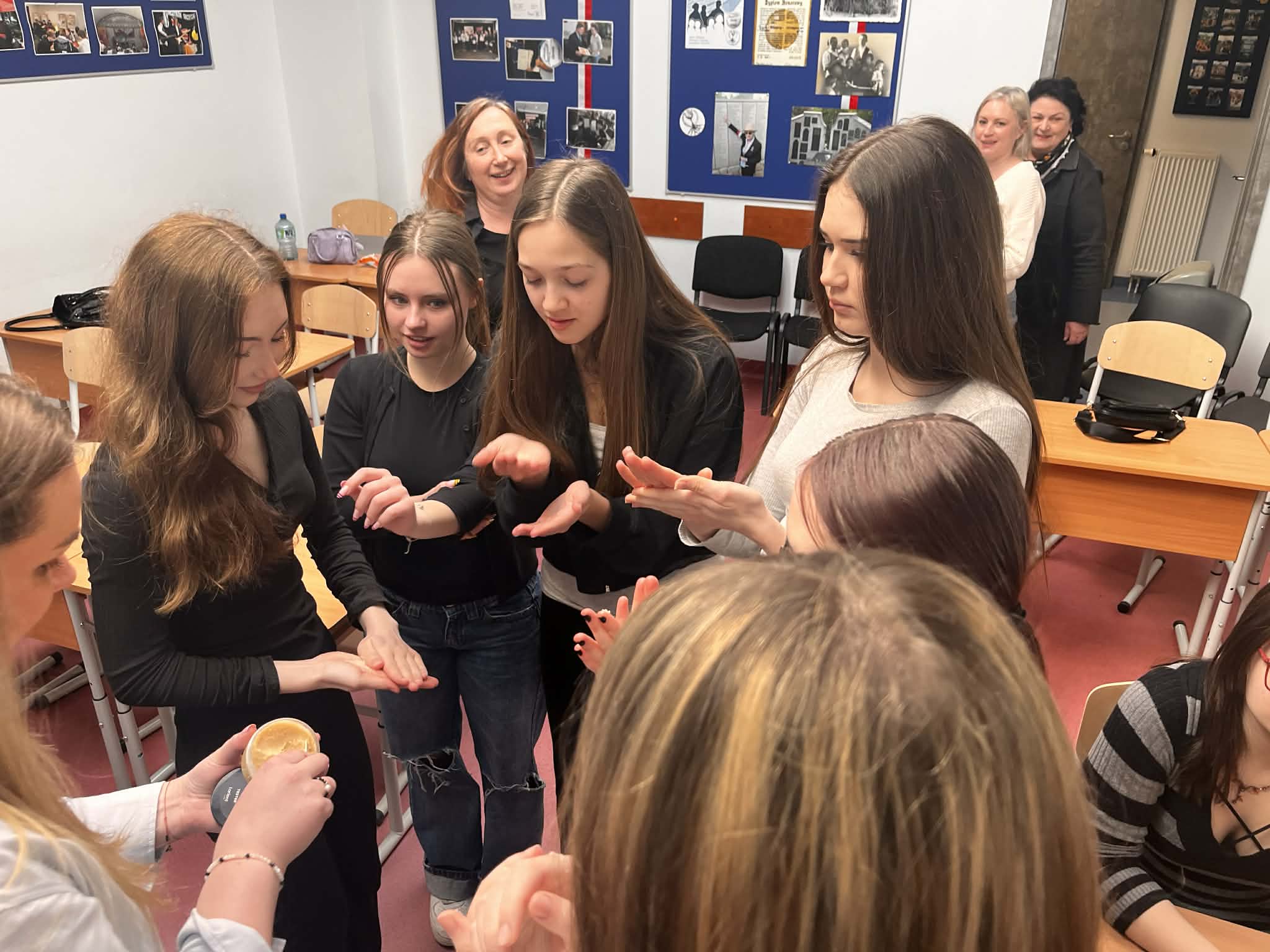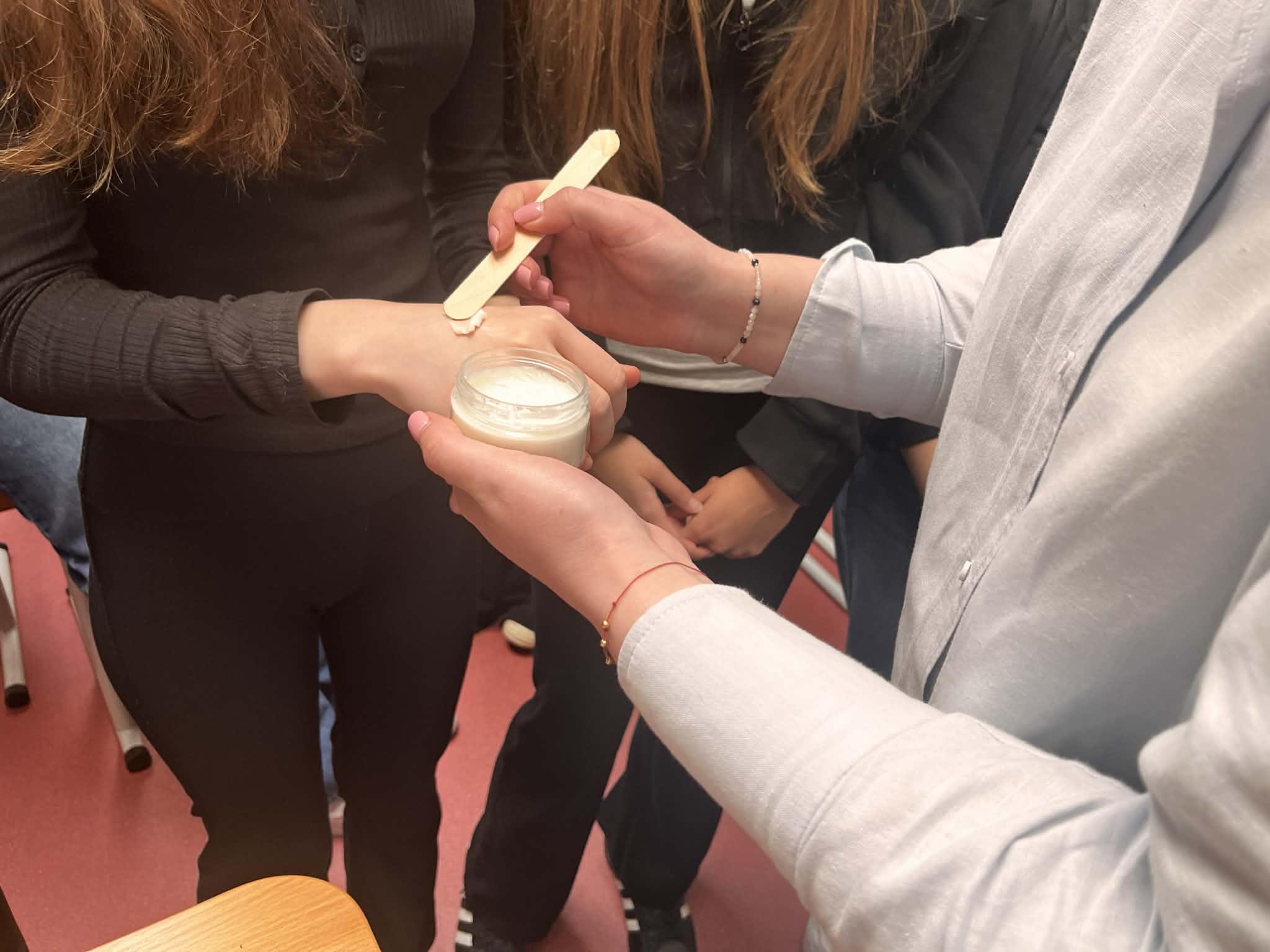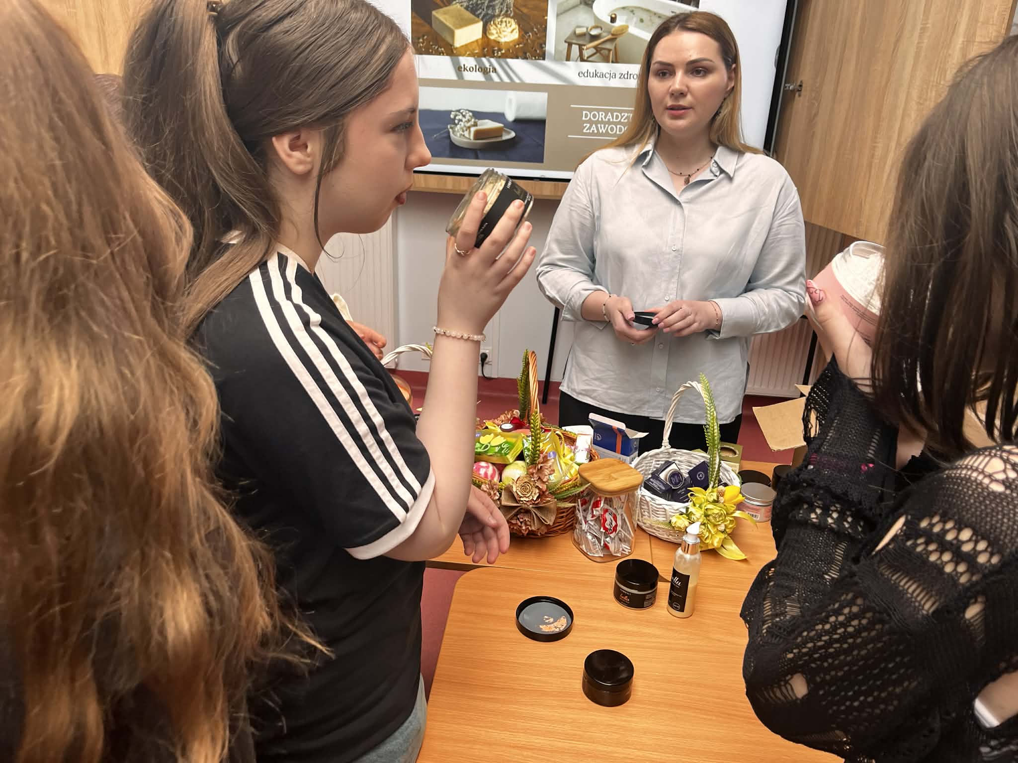 W ramach naszego tygodnia tematycznego pojawiło się wyjątkowe spotkanie łączące edukację zdrowotną i … doradztwo zawodowe. Nasz gość Pani Maria z Mydlarni u Franciszka opowiedziała nam czym różnią się kosmetyki naturalne od konwencjonalnych, jakie składniki naturalne są przyjazne dla skóry oraz jak wygląda ścieżka kariery w branży kosmetyków naturalnych. No i crème de la crème naszego spotkania, to każda uczestniczka mogła bezpośrednio na sobie, pod czujnym okiem Pani Marii, zastosować ekokosmetyki. W pracowni unosiły się świeże zapachy naturalnych (wiosennych) składników.Takie spotkanie, to świetna okazja do poszerzenia wiedzy, rozwijania świadomości zdrowotnej oraz inspiracji do przyszłych ścieżek kariery.